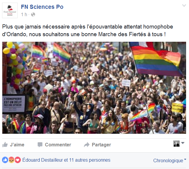 Sur leur page Facebook, les militants du « FN Sciences Po » souhaitent « une bonne Marche des Fiertés à tous » (c'est à dire pour la Gay Pride qui se déroule ce samedi 2 juillet).